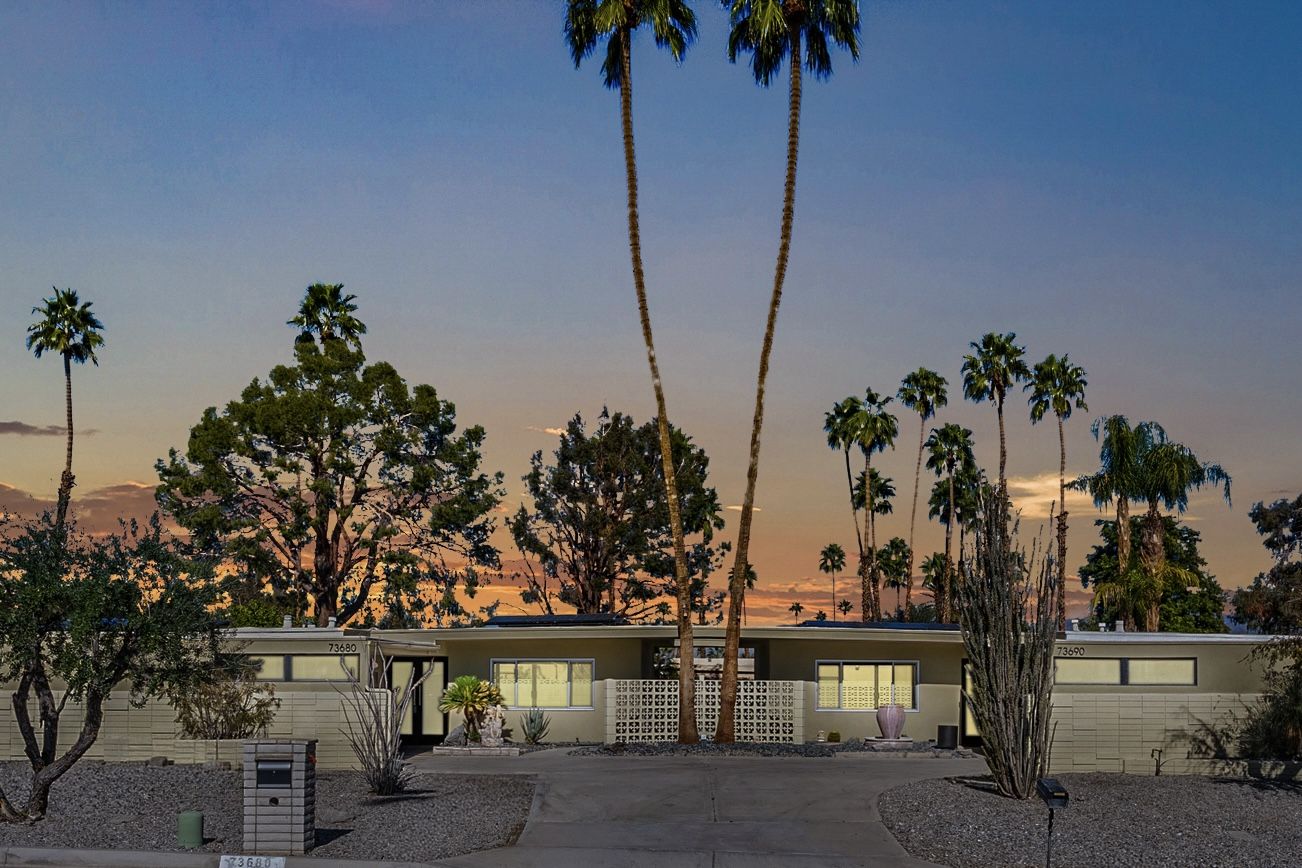 A rare and compelling opportunity in Palm Desert—73680 Buckboard Trail is being offered individually or as part of a paired acquisition with neighboring 73690 Buckboard Trail. Each single-level home is thoughtfully designed with no common walls, separate entrances, and a shared driveway that leads to individual covered carports—defining the feel of two completely independent properties while maintaining a cohesive aesthetic.
